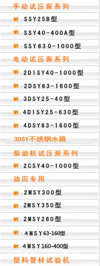 试压泵是专供各种压力容器、管道、阀门、蒸气锅炉等做耐压试验和橡胶塑料管件、机械部件的耐压密封或强度爆破试验,并可供试验室获得高压液体之用。泵的使用介质为水或类似水、油的乳化液。